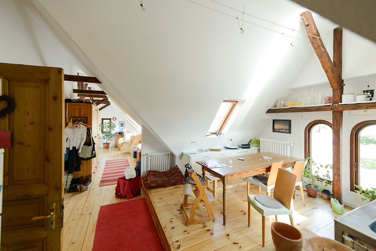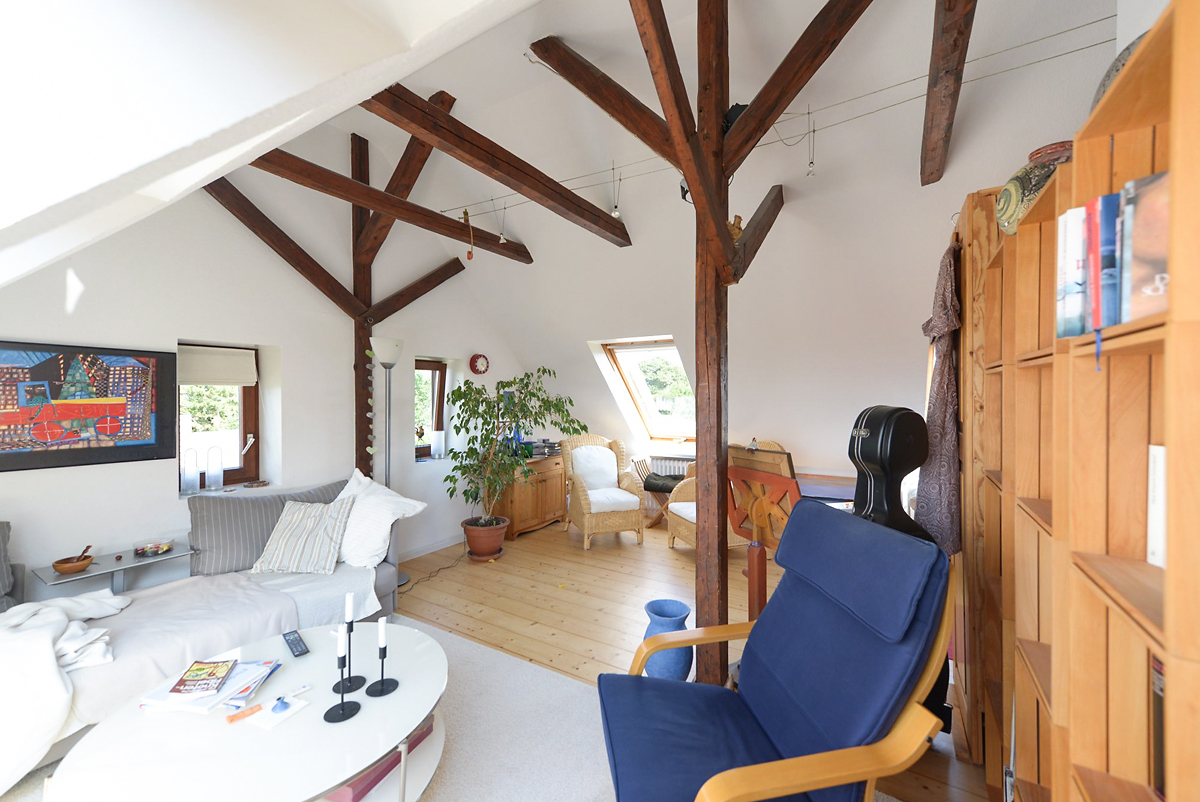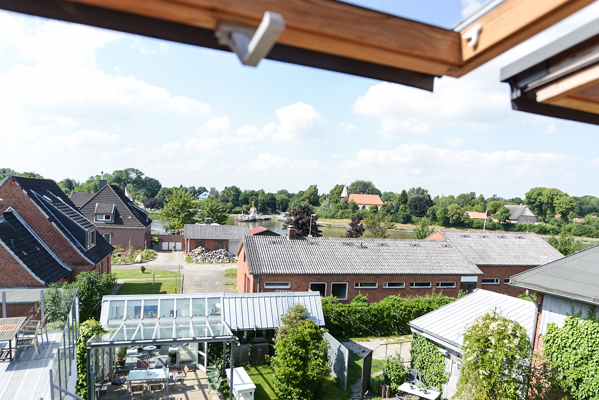 Blick frei heraus – nach Osten und Süden, in die Sonne am Morgen und tagsüber. Und nach Westen und Norden in den Abend über den Nord-Ostsee-Kanal. Erfüllung in der zweiten Etage.