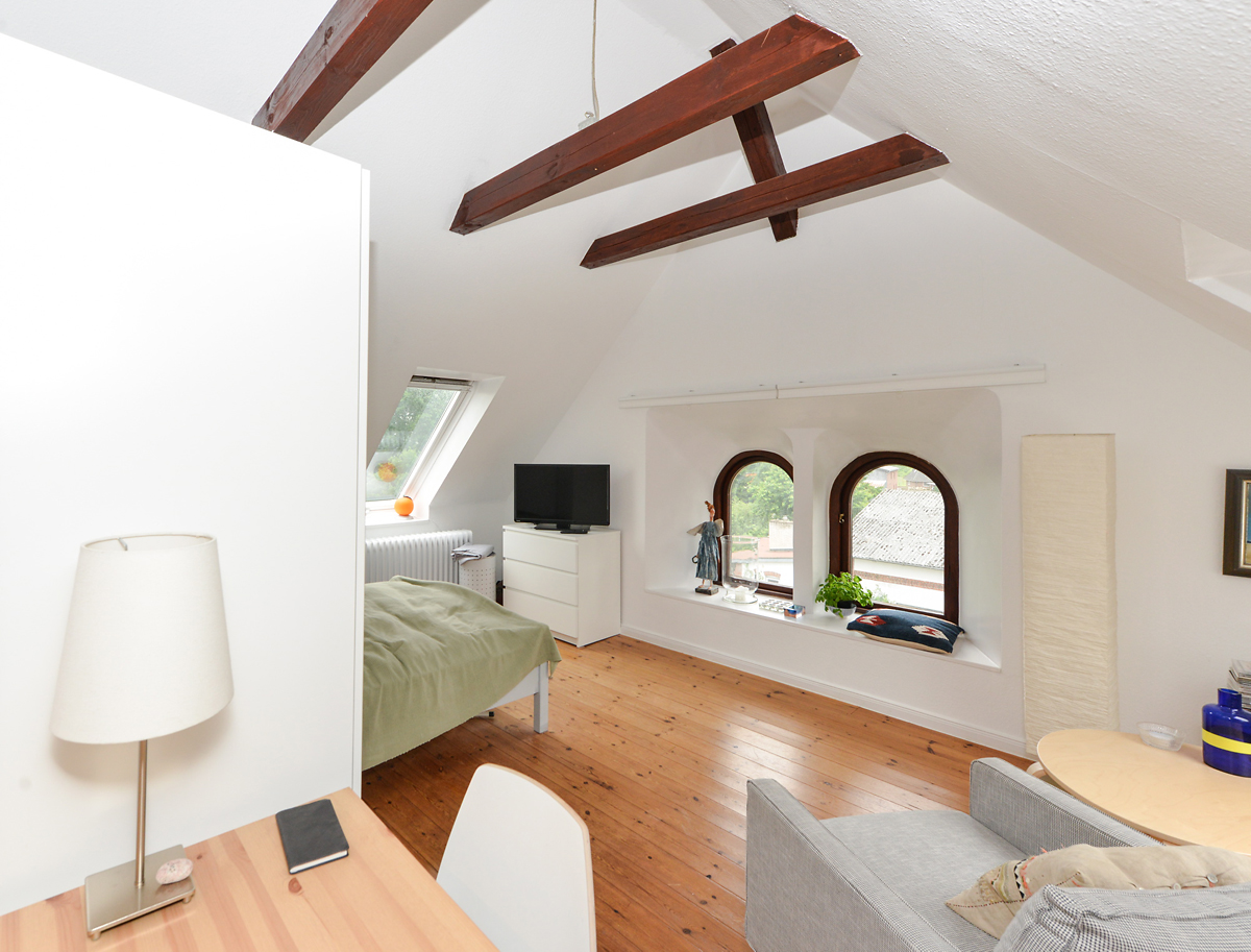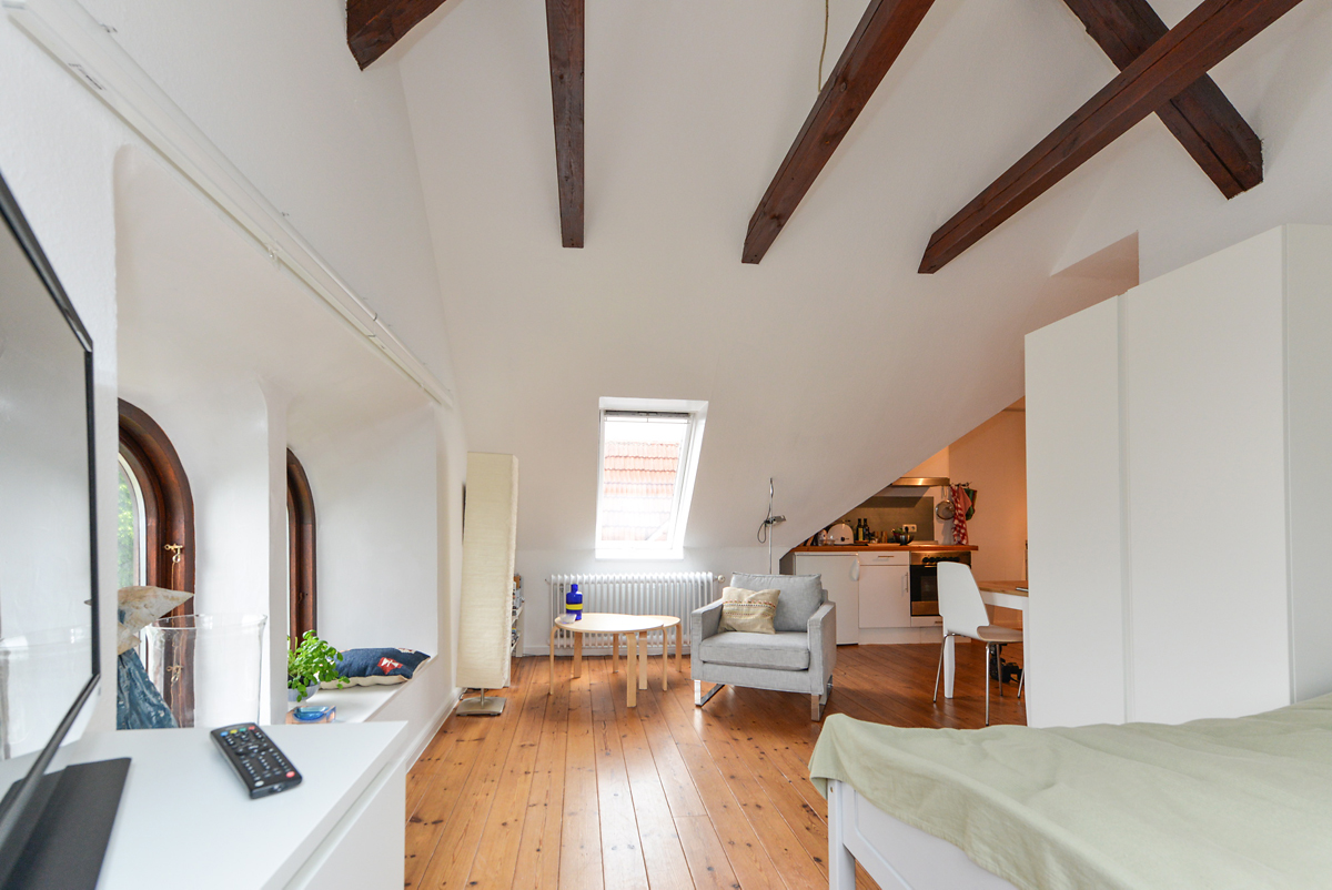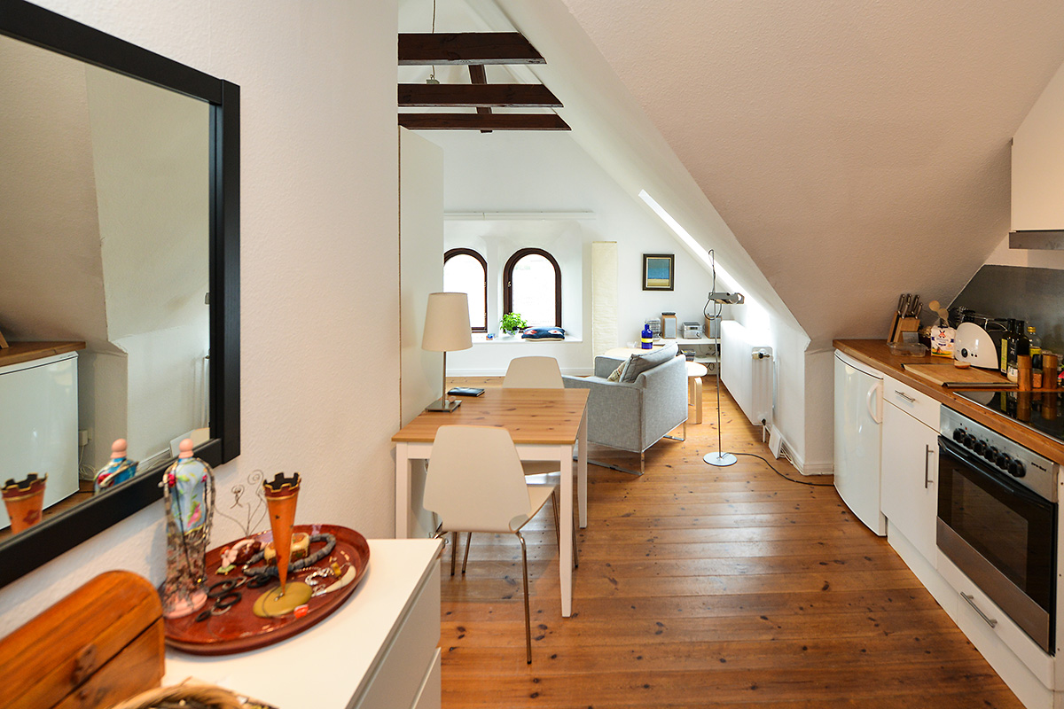 Klein, gemütlich, kompakt, individuell. Hier findet sich in einem Raum alles, was Mensch braucht. Gucken in den Himmel aus dem zweiten Stock inbegriffen.